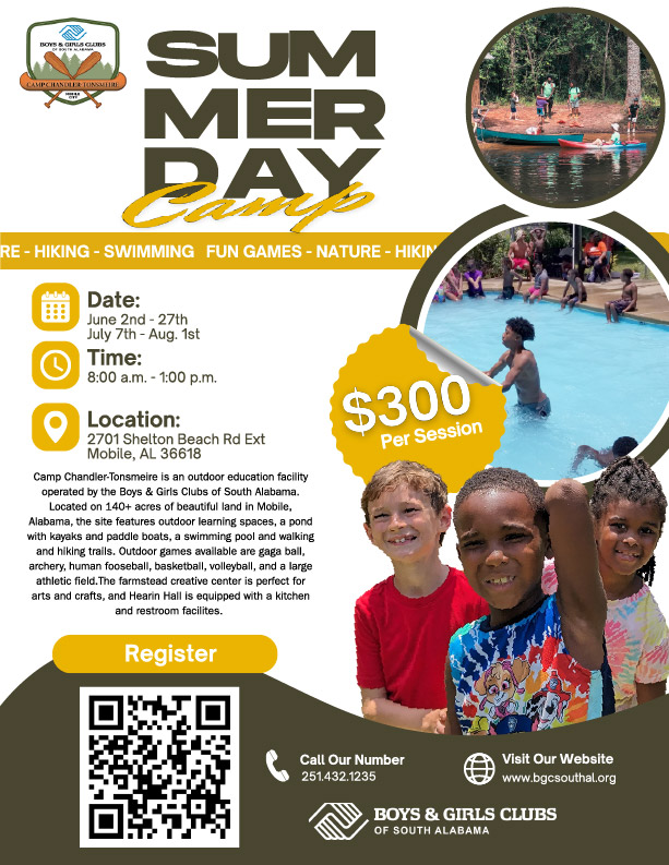 Camp Chandler-Tonsmeire is an outdoor education facility operated by the Boys & Girls Clubs of South Alabama. Located on 140+ acres of beautiful land in Mobile, Alabama, the site features outdoor learning spaces, a pond with kayaks and paddle boats, a swimming pool and walking and hiking trails. Outdoor games available are gaga ball, archery, human fooseball, basketball, volleyball, and a large athletic field.The farmstead creative center is perfect for arts and crafts, and Hearin Hall is equipped with a kitchen and restroom facilites.