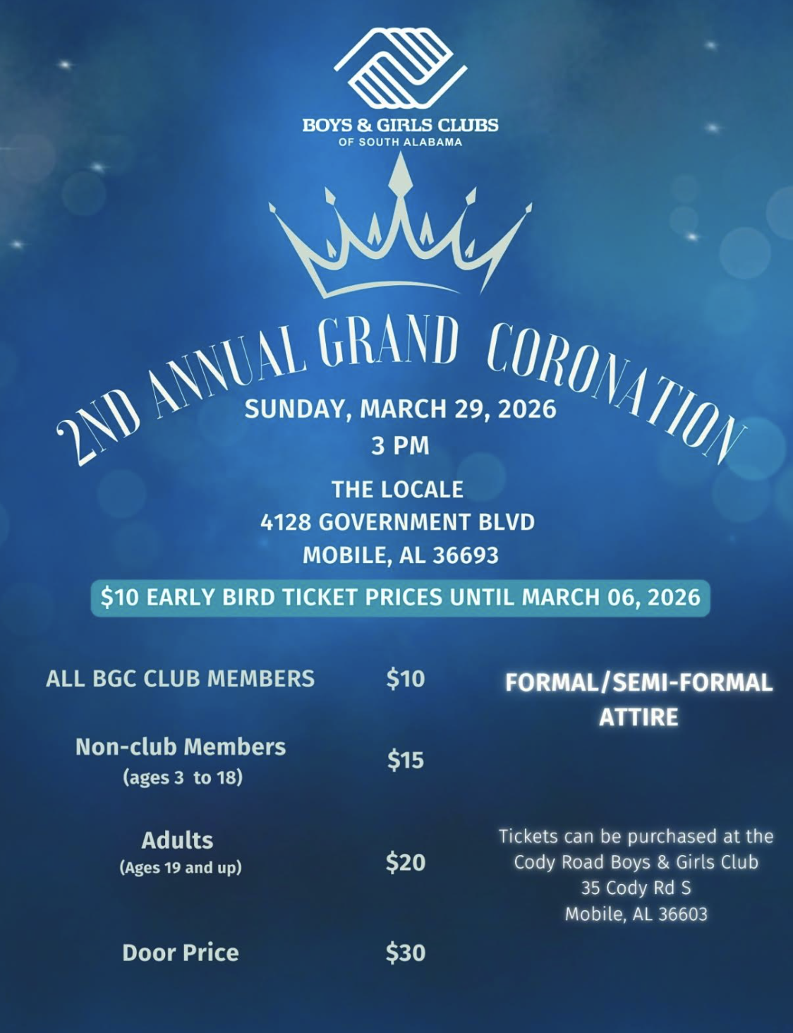 The Boys & Girls Clubs of South Alabama (BGCSA) invites the community to attend its 2nd Annual Grand Coronation on Sunday, March 29, 2026, at 3 p.m. at The Locale, located at 4128 Government Blvd in Mobile.